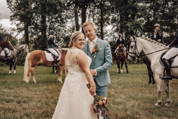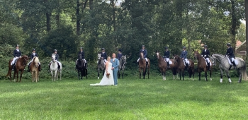 Afgelopen vrijdag 9 september werd er getrouwd.Bregje te Grotenhuis en Niels Klein Gunnewiek gaven elkaar het JA woord bij het Muldershuis in Eibergen. Wij mochten als rijvereniging hen begeleiden met een escorte naar deze locatie. Met een groep ruiters en amazones pikten wij het bruidspaar op. Met onderweg een pauze om een paar prachtige foto's te maken.