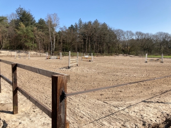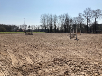 Wat is er de afgelopen tijd hard gewerkt! De grondwerkzaamheden zijn afgerond en er kan weer gereden worden op ons trainingsterrein. Er is maar liefst een rijbaan van 45 x 70 meter ontstaan, geschikt voor verschillende doeleinden.Maar de we zijn nog (lang) niet klaar. Er staat een tijdelijke afrastering in de rijbaan om zo verschillende rijbanen te creeëren voor de verenigingslessen. Binnenkort zullen de vlokken in de bodem worden verwerkt en worden de lichtmasten verplaatst. Daarna wordt een deel van het terrein opnieuw ingezaaid, wordt er een longeerbak gemaakt en wordt de buitenste omheining op een paar plekken verbeterd.